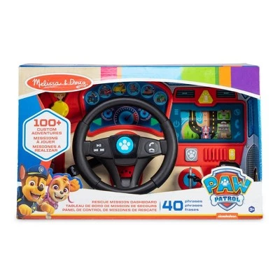 Rev up playtime and have hours of imaginative adventures in the driver’s seat with the PAW Patrol™ pups! Slide one of the three double-sided mission cards into the windshield of the wooden dashboard and set the dial to show who needs help. Press buttons to choose the pups for the mission and hear multiple phrases for each, then press the paw print “mission start” button to hear Ryder give mission instructions based on the pups chosen for the job—there are hundreds of possible combinations, and kids can choose to hear him in English, French, or Spanish! Turn the removable key to hear the engine rev and shift the gear to “D” to start the scrolling GPS–turn the steering wheel to keep the vehicle on the GPS track! Other features of the interactive dashboard include a horn that beeps, a siren button, blinkers that click, and a microphone for voice recording and playback! PAW Patrol™ is always ready to help, inspiring preschoolers with a blend of teamwork, adventure, and humor as they develop social, emotional, and developmental skills through play.