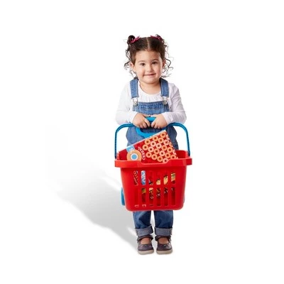 - Load up on play kitchen and grocery store essentials with this durable rolling grocery basket and play groceries