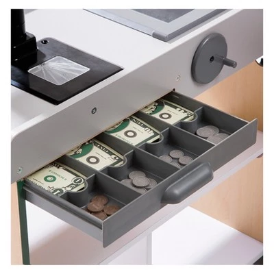 - Includes hand-cranked conveyor belt, beeping “scanner,” bagging area, card swipe machine, and cash drawer