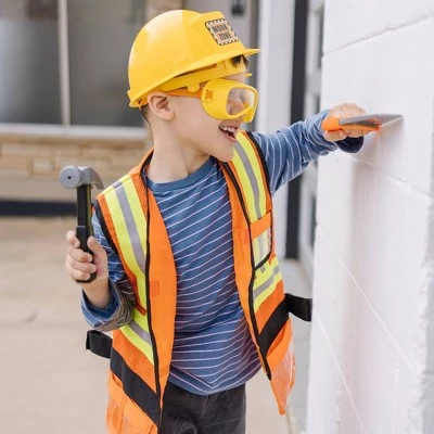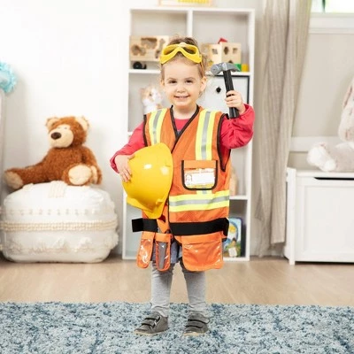 Work zone ahead! Your little construction worker will be ready for the job with this bright orange, machine-washable, vest high-lighted with reflective material and a tool belt, a yellow hard hat, “safety” goggles, a hammer, a saw, and a name tag for personalizing.