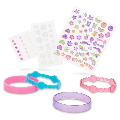 - Includes 4 bangle-style durable plastic bracelets, 4 soft reversible bracelets, and 2 reversible headbands to design and decorate