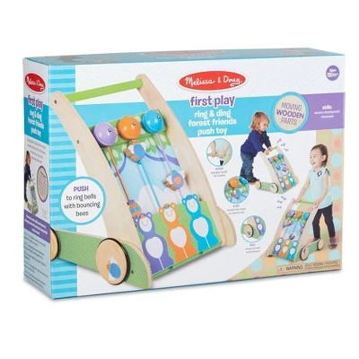 - Sturdy and colorful wooden push toy with friendly bear artwork and bells that ring and ding when struck by bouncing wooden bees