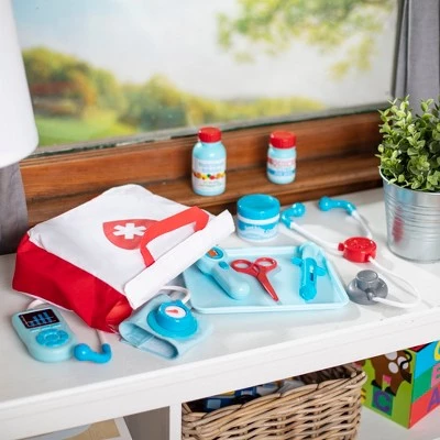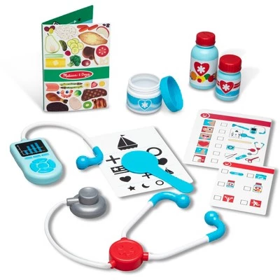 - Includes play stethoscope, blood pressure cuff, hearing tester, syringe, scissors, tweezers, rolling forehead thermometer, reflex hammer, otoscope, eye cover, tongue depressors, bottles, ID badge, activity cards, and more