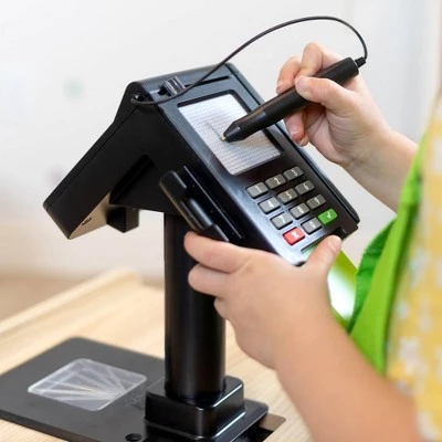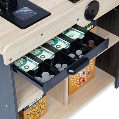 - Free-standing market includes hand-crank conveyor belt with divider bar, cash drawer, play money, beeping scanner with working calculator (2 AA batteries required, not included), signature pad, keypad, double-sided sign, credit card to swipe