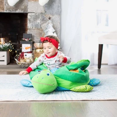 Kids will have a ball with this crinkling, jingling, multi-textured toy! The giant, friendly turtle comes filled with 60 squeezable multi-colored balls that are easy to grasp, toss, and roll. Zipper and self-stick tabs open so baby can sit inside, and close to store balls and to make a fun pillow. Features include holes to push and pull balls through, a non-slip bottom, crinkling feet, squeaking button, textured ring, mirror, silky fabric tags, and attached soft ball rattle.