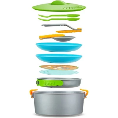 - 27-piece pretend play camp cooking set with play burner, nesting cookware, folding utensils, and play food