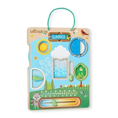 Explore the outdoor experience of observing and tracking weather conditions and more with this hands-on double-sided Wooden Weather Board! Flip the built-in block to show the season, slide knobs and levers to indicate precipitation, leaves on trees, temperature, and wind, flip a bungee-hinged piece to show phases of the moon, and spin a dial for clouds and sun! Self-contained pieces and a cord handle make the board portable and a great travel activity for kids three and older. Let ‘s Explore encourages kids to connect with the natural world through imaginative play! Discover the joy of outdoor adventures that instill curiosity and confidence while inspiring kids to say, “Let ‘s Explore‚Ñ¢‚Äù!