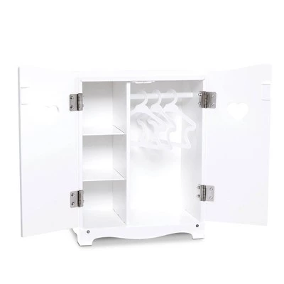 Help favorite dolls and stuffed animals get organized with this realistic and modernly styled wooden armoire that suits any décor! There are three shelves for folded doll clothes and a rod with three hangers for dresses and jackets (clothing not included). The sturdy white closet with two hinged doors stands approximately 17 inches tall and features a wipe-clean surface. Clear instructions make it easy to assemble with just a screwdriver (not included). Mine to Love dolls and accessories encourage empathy and help kids express themselves as they explore grown-up roles and responsibilities. A child’s confidence and self-esteem blossom and grow with each nurturing moment of imaginative play!