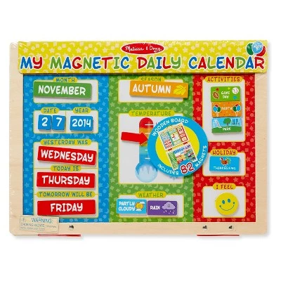 What is today? For a child, that simple question can have so many answers–and this daily calendar helps satisfy them all! Kids will feel a greater sense of control and responsibility when they help post the day of the week, date, weather, and special events on the large magnetic board for all to see. There’s even a space to post their mood–an excellent way to open communication and encourage children to gauge their own emotions. Updating the information is simple: Simply take a preprinted magnet from the lower magnetic board (which hangs below the calendar to keep magnets within easy reach). Then place it on the calendar to fill in the information . . . or make a custom magnet by writing on one of two dry-erase magnet tiles! There are fields for day, date, season, weather, temperature, activities, holiday, and mood.