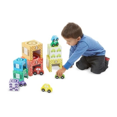 - Match-and-stack set of 7 stacking garages and 7 wooden cars