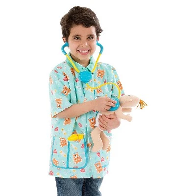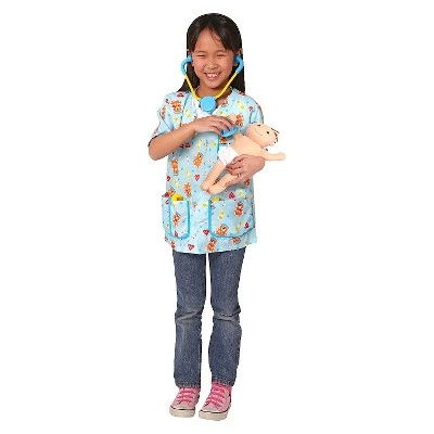 - This pediatric nurse costume and play set has everything little nurses need to take care of a newborn baby–including the baby! Nurses-in-training can slip on the cheerful, gender-neutral uniform (complete with customizable hospital ID tag), then fill the pockets with tools for a pretend-play checkup. The included stethoscope, ear scope, thermometer, and syringe help make sure all is well with the cuddly newborn–or help patch up any imaginary booboos and sniffles. The plush baby doll has a removable cloth diaper with self-stick closures for easy changes before or after the checkup, and a sweet smiling face to encourage emotional connection and communication.