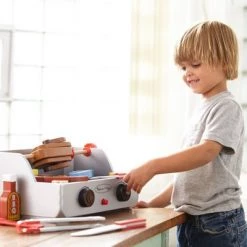 Grill it, slice it, and turn it! Cook up a fantastic feast with this deluxe wooden barbecue play set! The 24-piece set includes specialty grilling favorites like a whole rotisserie chicken that spins on a skewer, a whole fish, sausage, shrimp, and even vegetables for grilling kabobs. Use the kid-friendly wooden basting brush, spatula, tongs, and knife to prepare, flip, grab, and cut the food. This grill is easy to “fire up” with its ignition switch; adjust the temperature with the movable knobs on the barbecue, and turn the rotisserie so the food grills to perfection! The chicken, fish, and sausage pieces are held together with self-stick tabs; use the knife to slice them apart. After mealtime, use the grill as a handy storage place for all the items! The Wooden Rotisserie & Grill Barbecue Set encourages hand-eye coordination, fine motor skills, creative expression, and imaginative play.
