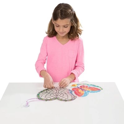 This peel-and-press sticker craft gives kids everything they need to easily create a spectacular piece of “stained glass” art. Just hold up the sheet of colored stickers to the clear frame, peel them off one at a time, and stick them on. Grooves and outlines on the frame make it easy to fit each sticker–featuring realistic textures like bubbles or swirls–into just the right spot. Use the included cord and suction cup to hang the finished artwork in a sunny window to see the beautiful butterfly shimmer to life. Young artists will be enchanted by the results and proud to show them off!