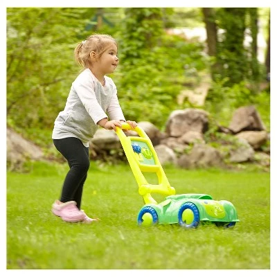 Doing yard work is a snap when the cheerful Snappy Turtle helps! This cleverly designed plastic lawnmower has lots of ways to interest little ones: a storage compartment under the shell, a plastic fuel can to “pour,” dials that turn, slide, and click, and a pull-cord that makes a motor sound! Made from durable materials with Snappy’s smiling face, this is a mower is great for indoor or outdoor play. It’s got a sturdy handle to help new walkers, and will encourage gross motor skill development, role play activities, and an exploration of the natural world. Lock handle in place before giving to child.