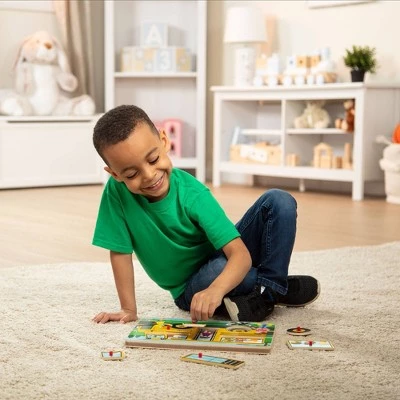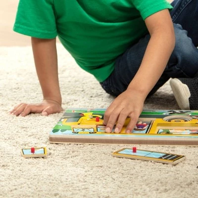 - PEG PUZZLES SET: The Melissa & Doug Wheels on the Bus Sound Puzzle is an entertaining and educational developmental toy for kids. It plays verses of the wheels on the bus when each of the 6 pieces are lifted, and includes the lyrics. (AAA batteries not included.)