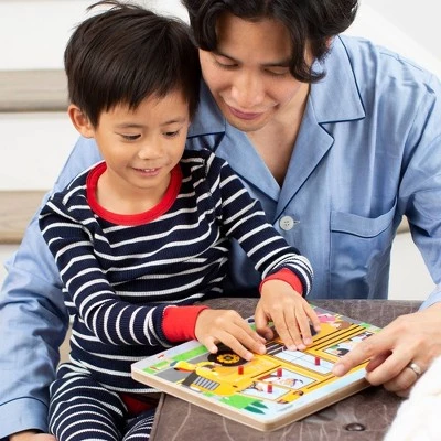 Sing along as the wipers go, “swish, swish, swish,” the horn goes, “beep, beep, beep,” and more! The lyrics are on the back of the sturdy wooden resting board to help kids learn the words. Shaped wooden pieces with durable plastic pegs are easy for small hands to grasp, making this a perfect preschool puzzle (ages 2+) that helps with fine motor skill development, as well as auditory processing. This wooden peg puzzle plays verses of “The Wheels on the Bus” when pieces are lifted. This puzzle is an educational gift for kids ages 2 to 4 years. Add the Melissa & Doug Alphabet Sound Puzzle to round out the hands-on play experience and to give kids an engaging option for screen-free fun.