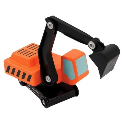 - Bright-orange excavator swivels 360 degrees on its wheeled base.