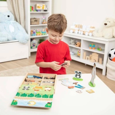 Combine dozens of wooden magnetic pieces in coordinating designs to outfit two double-sided friends and their dogs! Mix and match wooden magnetic clothing and accessories to get the characters ready for work or adventures (doctor, chef, astronaut, construction worker, superhero, pirate, knight, cowboy/cowgirl, firefighter, police officer). The play figures, each with a durable stand for pretend play, and the magnets all store in a sturdy wooden tray with a slide-in lid and convenient carrying handle to take the fun on the go! This unique dress-up dolls set helps kids three and older develop hand-eye coordination and fine motor, counting, and sorting skills, and encourages creative expression and imaginative play.