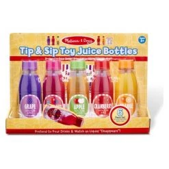Pretend to pour refreshing drinks, and watch as the liquid in these five durable plastic juice bottles “disappears”! Stock play kitchens, grocery stores and picnic baskets with Grape, Orange, Cranberry, Apple, and Berry Mix bottles. The reusable menu card lets kids three and older place orders and offers creative combinations to spark play ideas. Not only will this play set quench a thirst for pretend play, it promotes early learning skills like color recognition, language, sensory development, and more!